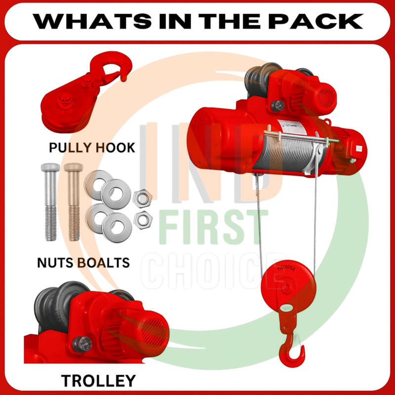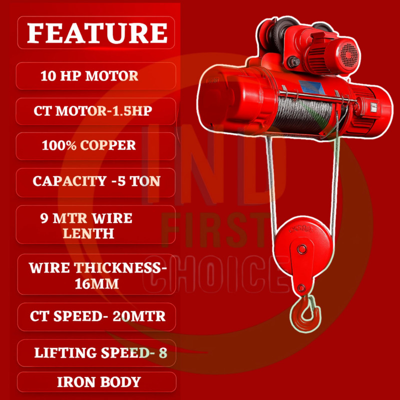 The IND FIRST CHOICE CD-1 Wire Rope Hoist with 2 Ton capacity and 9 Meter lift height is designed for safe, reliable, and heavy-duty industrial lifting. Equipped with a powerful 4 HP motor and 13 mm wire rope, this hoist provides efficient vertical lifting for overhead cranes, gantry cranes, and industrial material handling systems.