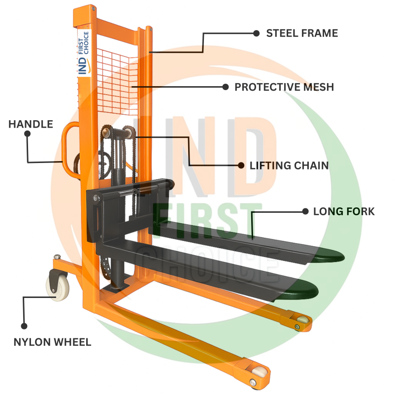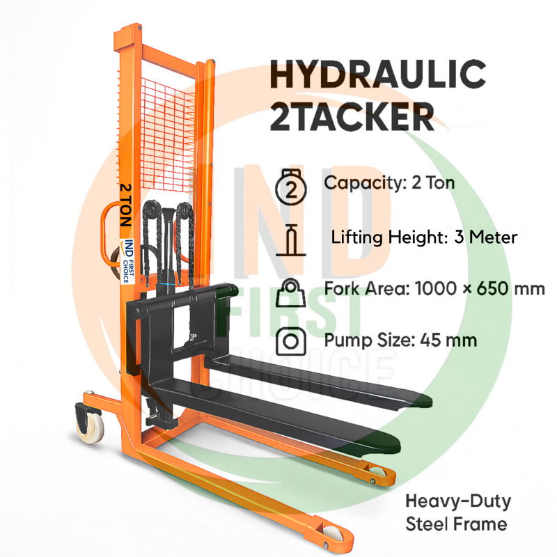 The IND FIRST CHOICE Manual Hydraulic Stacker with 2 Ton capacity and 3 Meter lift height is built for safe, efficient, and heavy-duty material handling in warehouses, workshops, and industrial operations. Featuring long forks (1000×650 mm), a robust steel frame, and protective mesh, this stacker ensures durability, stability, and smooth performance for high-reach stacking applications.