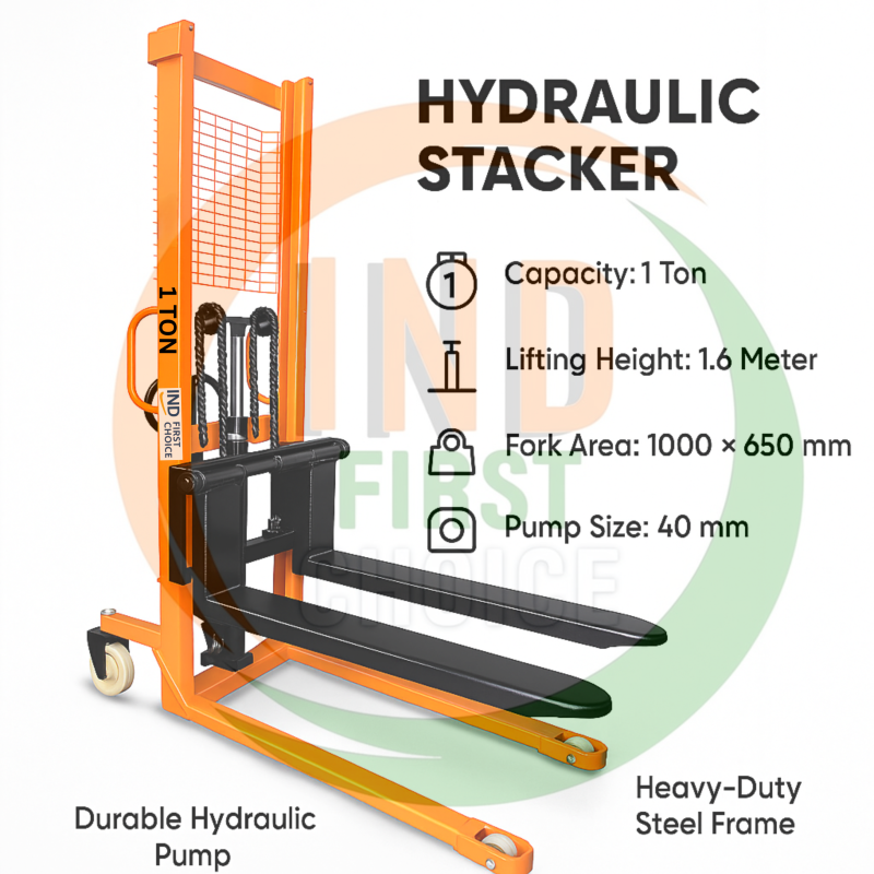 The IND FIRST CHOICE Manual Hydraulic Stacker with 1 Ton capacity and 1.6 Meter lift height is designed for safe, smooth, and efficient material handling in warehouses, workshops, and industrial facilities. Featuring long forks (1000×650 mm), a protective mesh, and durable nylon wheels, this stacker provides reliability, safety, and ease of operation for medium-height stacking applications.