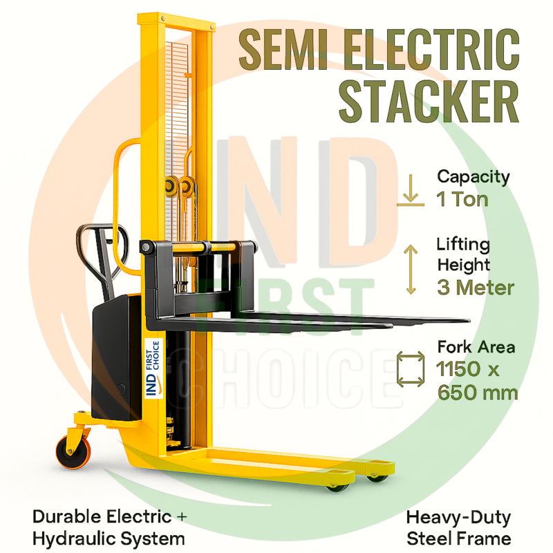 The IND FIRST CHOICE Semi Electric Stacker with 1 Ton capacity and 3 Metre lift height is designed for heavy-duty material handling in warehouses, factories, and industrial facilities. With its heavy-duty steel frame and 1150×650mm fork dimensions, this stacker combines electric-powered lifting with manual movement to deliver efficiency, durability, and cost-effectiveness.