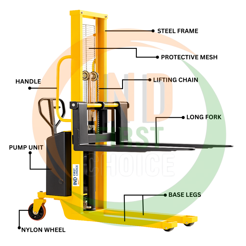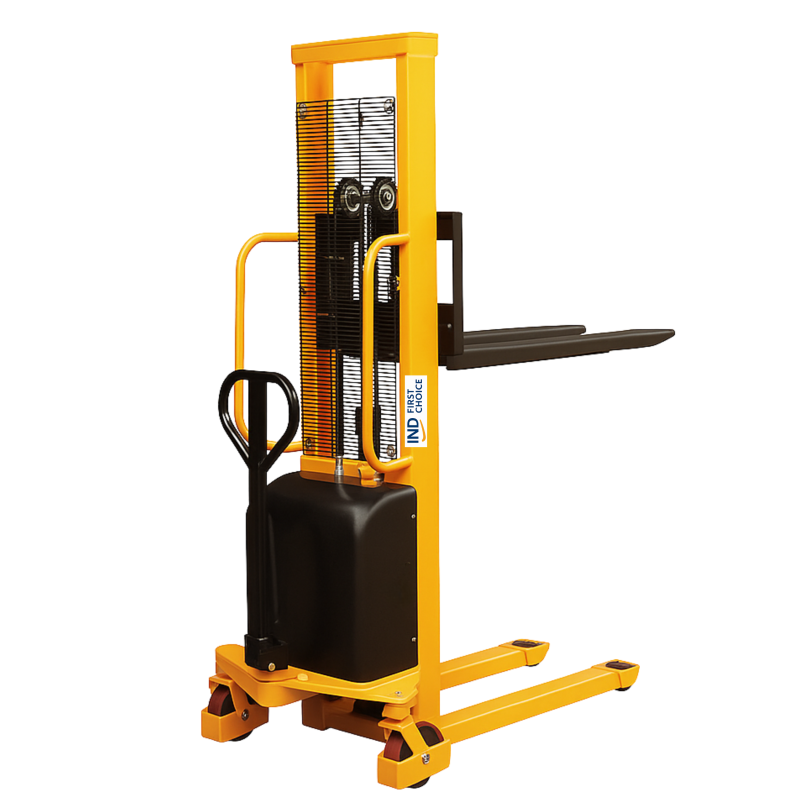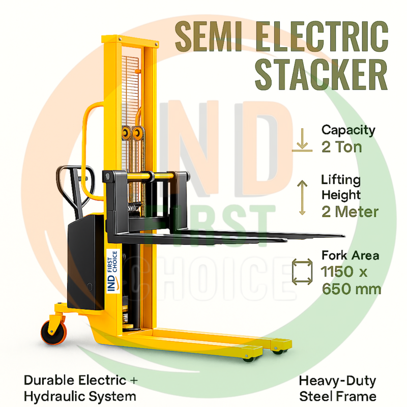 The IND FIRST CHOICE Semi Electric Stacker with 2 Ton capacity and 2 Metre lift height is engineered for safe, efficient, and heavy-duty material handling in warehouses, factories, and industrial operations. Featuring a heavy-duty steel frame and 1150×650mm fork area, this stacker combines electric lifting with manual movement, providing a cost-effective and powerful solution for modern material handling needs.