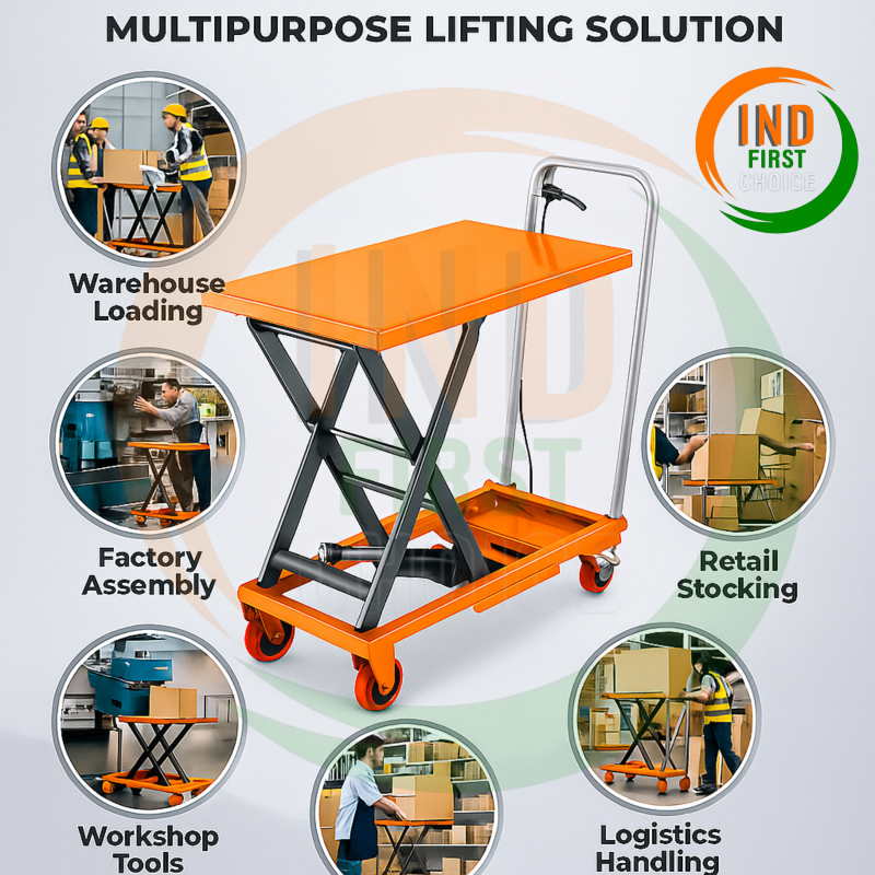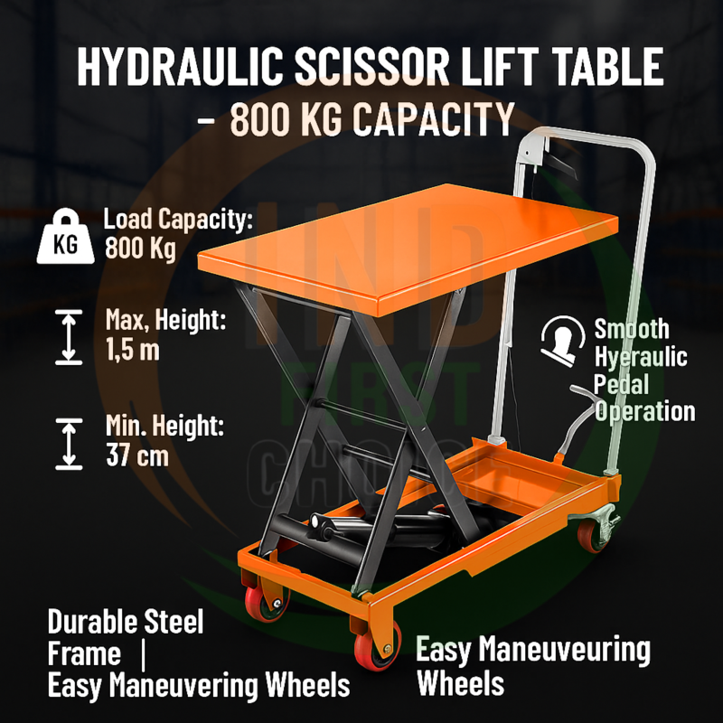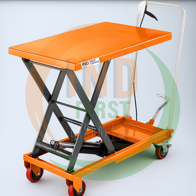 The IND FIRST CHOICE Manual Hydraulic Scissor Lift Table with 800 Kg capacity and 1.5 Meter lift height is built for heavy-duty material lifting and positioning in warehouses, factories, and industrial workshops. Featuring a robust hydraulic system, reinforced steel platform, and smooth mobility wheels, this lift table ensures durability, reliability, and high performance for demanding industrial applications.
